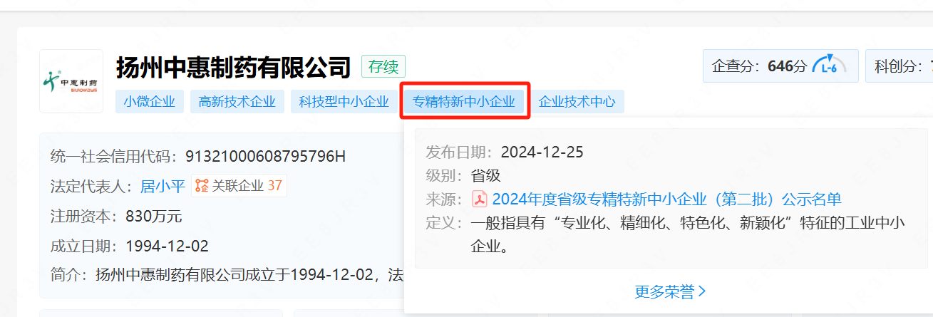 近日,經過嚴格評審,揚州中惠制藥有限公司再度獲得殊榮,被評為“專精特新”企業(yè)。這一榮譽充分認可了公司在制藥領域的卓越表現(xiàn)和創(chuàng)新實力。